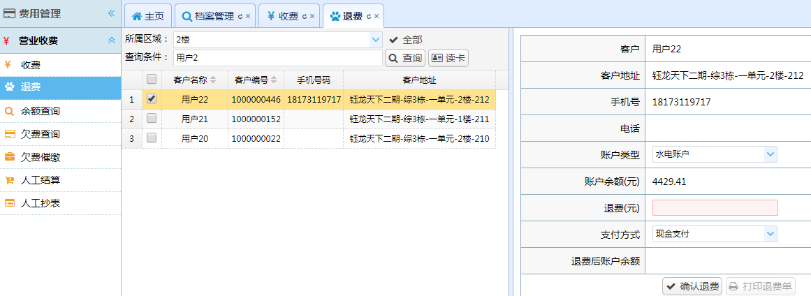 2. 管理员通过用电管理平台【H家园智慧能耗综合平台】-【费用管理】-【营业收费】,找到对应的客户做退费和收费处理。