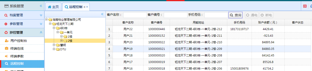 2. 管理员通过用电管理平台【H家园智慧能耗综合平台】-【系统管理】-【抄控管理】-【远程控制】,找到对应的客户做手动下发合闸命令。