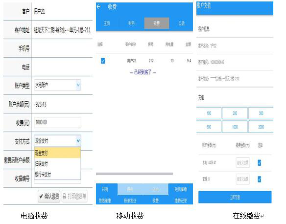 H家园系统提供三种收费方式:电脑系统收费功能、H家园移动收费功能、H家园移动在线缴费功能。电脑系统缴费通过U盾密码锁进行权限控制并通过电脑上网进行收费管理;H家园手机物业端通过手机收费密码进行现金缴费权限控制;在线缴费由用户自助进行缴费与自动控制(缴费后自动合闸上电)。