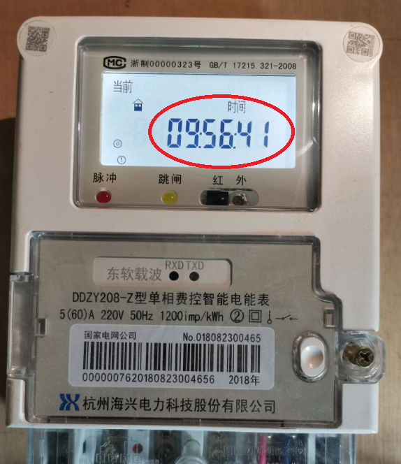 如图所示的“09:56:41”为电表内自带的时间表示上午9点56分41秒,一般与北京时间相差不超过5分钟,如果当前时间与北京时间相差超过5分钟,表示电表出现了计时问题。