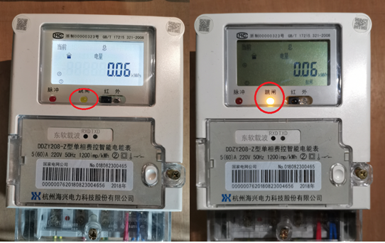 如图所示的“跳闸灯”当前未亮表示电表为合闸状态,表示当前表计为出线通电状态,当“跳闸灯”亮起,表示电表为跳闸状态,表示当前表计为出线断电状态。