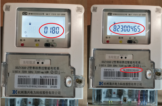如图所示的“0180”与“82300465”,加起来为电表的完全逻辑地址“018082300465”。